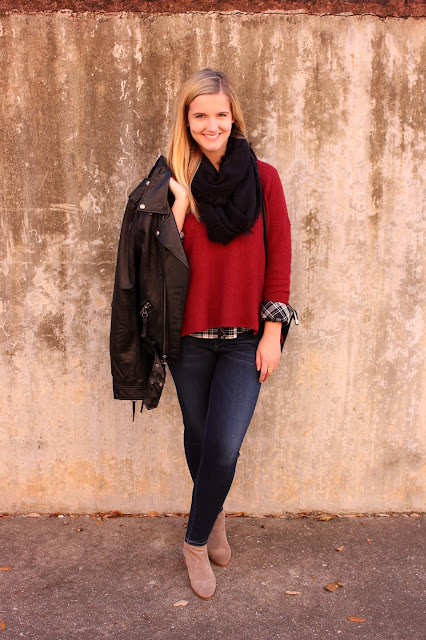 Style Elements: Body Bark Reversible Tank in Black, Joie 'Sharmila' Top in Caviar, Cupcakes and Cashmere 'Mazie' Sweater in Brick Red, Linea Pelle Moto Leather Jacket in Black, Citizens of Humanity 'Rocket' High Rise in Starlite, Michael Stars 'Cozy and Solid' Eternity Scarf in Black, Gorjana 'Teagan' Ring in Gold, TKEES 'Foundations' Flip Flops in Sunkissed, Dolce Vita 'Tessey' in Taupe.