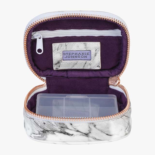 Stephanie Johnson: Laura Large Trapezoid in Carrara, ML Traveler in Carrara, Steph Tiny Treasure Case in Carrara.